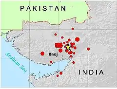 El terremoto de Guyarat de 2001 ocurrió a las 08:46 AM hora local (03:16 UTC) del 26 de enero de 2001, en el 51.er Día de la República de la India, y tuvo una duración de más de dos minutos. El epicentro se situó a cerca de 9 km al sur-suroeste de la localidad de Chobari[4] en el taluka de Bhachau, Distrito de Kutch en el estado de Guyarat.[5] El terremoto alcanzó 7.7 grados Mw y tuvo una intensidad máxima de X (Extremo) en la escala de Mercalli. Produjo alrededor de veinte mil fallecidos (incluyendo 18 personas en el sudeste de Pakistán), dejó 167 000 heridos y destruyó cerca de 400 000 viviendas.[3]
