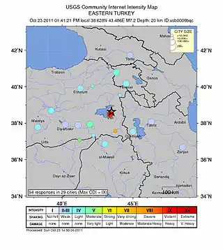 El terremoto de Turquía de 2011 fue un sismo ocurrido a las 13:41:21 hora local (UTC+3) del domingo, 23 de octubre de 2011, con una magnitud de 7.4 MW. Su hipocentro se ubicó a 16 km tierra adentro y su epicentro fue la localidad de Van al este de Turquía.[1] El sismo fue incluso sentido en Irán y en Armenia según reportes ciudadanos al Servicio Geológico de los Estados Unidos (USGS por sus siglas en inglés).[5] Los expertos turcos afirmaron que las víctimas fatales podrían ascender a más de mil debido a las normas deficientes de construcción y la potencia del sismo en la región.[6]