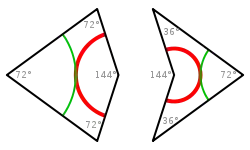 - La flecha es un cuadrilátero no convexo (cóncavo) que tiene cuatro ángulos interiores que son de 36, 72, 36 y 216 grados. La flecha puede ser bisectada a lo largo de su eje de simetría para formar un par de triángulos obtusángulos de Róbinson
