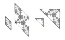 - Su no periodicidad está implícita en su estructura jerárquica: los teselados son teselados de sustitución que surgen de reglas de sustitución para bloques cada vez más grandes. Esta estructura de sustitución también implica que: