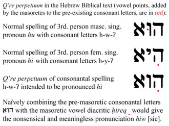 En el Pentateuco, el pronombre singular en tercera persona femenino היא (hī) muchísimas veces (120 veces en el Deuteronomio)[101] se escribe igual al pronombre singular masculino הוא (hū). Los masoretas señalaron esta situación agregando el símbolo diacrítico (niqud o punto), que corresponde a la letra i, a la grafía con solo consonantes premasorética הוא (ver diagrama). La ortografía resultante pareciera indicar la pronunciación hiw, pero esto no tiene sentido en hebreo bíblico y un lector entendido del texto bíblico sabría que debe leer el pronombre femenino hī en su lugar.