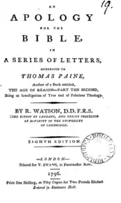 - Watson, Richard. An Apology for the Bible, in a Series of Letters, addressed to Thomas Paine. Philadelphia: James Carey, 1979.