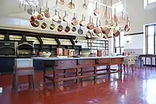 La cocina - Cocina a diferencia de otras cocinas de la época, estaba situada en el primer piso lejos de la casa principal para evitar la posibilidad de que los incendios y los olores de la cocina llegaran a las partes nobles de la casa. Bien ventilada, contaba con un 6,4 m estufa de hierro fundido, que calienta como un solo elemento a través de una estufa de carbón. La mesa de trabajo está hecha de zinc, un metal que sirvió como precursor del acero inoxidable; frente a él hay un mortero de mármol que se usa para triturar varios ingredientes. El hielo cortado de los estanques locales mantenía frescos los cuartos laterales donde se almacenaban los alimentos y facilitó un cuarto más frío para ensamblar los dulces.[8] La cocina y la despensa para hornear tienen cada uno un montacargas que viaja al nivel del sótano donde se entregaron los comestibles y se retiraron los desechos.