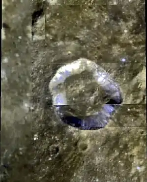 ![]() Vista de Theaetetus en el espectro ultravioleta. Imagen de la misión Clementine |