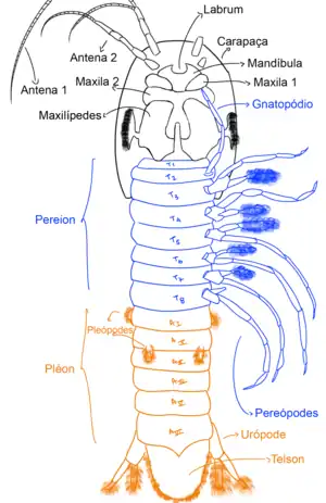 En la cabeza, la boca está rodeada por los labios superior e inferior (o labro y labio), la mandíbula, los maxilares 1 y 2 y los maxilípedos. El labio superior es una extensión del tegumento anterior del caparazón.