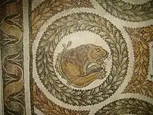 El mosaico que se denomina Teseo y el Minotauro se puede datar a finales del siglo III. En este mosaico se representa la batalla final donde Teseo se dispone a cortar la cabeza al Minotauro.[31] Este mosaico se complementa con escenas de monstruos marinos y naturaleza muerta.[32] También en varios mosaicos podemos encontrar escenas de vida cotidiana, como escenas de caza a caballo con perros.[33]