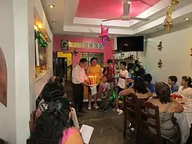 ![]() Celebraciones de la Nochebuena en una familia católica de Iquitos, Perú. Se puede ver símbolos como la corona de Adviento y una estrella de cartón que simboliza a la estrella de Belén. | ||