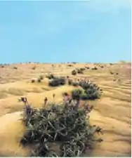 Se encuentra en Perú y Chile, es común en sus franjas costeras, donde forma extensos campos en arena. Se encuentra generalmente a alturas entre 600 y 1200 m s. n. m. donde está expuesta a la influencia de la neblina costera, la camanchaca. Subsiste en zonas con menos de 2 mm de precipitaciones anuales. Alcanza 40 cm de altura.