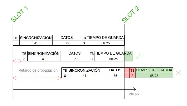 Es esencial que la parte de la ráfaga que contiene los datos (información útil) no sobrepase el time slot, puesto que en ese caso se produciría colisión entre datos de distintos terminales y se perderían ambos paquetes. Con el fin de cubrir pequeños retardos, se introduce al final de cada paquete un período sin información, llamado intervalo de guarda, que sí puede llegar fuera de los límites del slot correspondiente. No obstante, a veces este margen no es suficiente, ya que el tiempo de propagación de la señal varía en función de la distancia entre el terminal y la BS provocando un retardo mayor o menor.