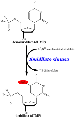 La enzima timidilato sintasa cataliza la reacción de transferencia de un grupo metilo desde el N5,N10-metilenotetrahidrofolato al desoxiuridilato (dUMP). Como producto de esta reacción se obtiene timidilato (dTMP) y 7,8-dihidrofolato, el cual se libera de la enzima y se recicla, por medio del ciclo del folato, nuevamente a N5,N10-metilenotetrahidrofolato.[2]