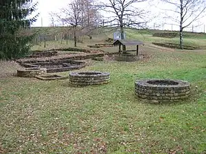 Un profundo foso de 4 m de ancho, perpendicular a la calzada, separaba el espacio residencial del espacio público. El área residencial que cubría alrededor de 30 ha consistía en casas rectangulares, 14 m de largo por 8 m de ancho, construidas con mampostería ligera. Estaban equipadas con chimeneas y, a veces, hornos. En el espacio público se han encontrado los restos de una gran sala, de 14 m cuadrados. Este podría haber sido un lugar de encuentro con fines políticos o religiosos.