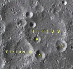 Titius es un cráter de impacto lunar que se encuentra en el Luna de cara oculta, más allá del terminador oriental. Se encuentra al oeste de la Lacus Solitudinis, un pequeño mar lunar. Menos de un diámetro de cráter al noreste es el cráter Bowditch, y más al suroeste es Donner.