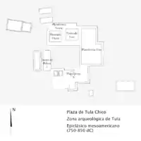 El conjunto arquitectónico de Tula Chico tiene su origen en el Epiclásico, cuando Tollan era una pequeña ciudad de hasta seis kilómetros de superficie. Tula Chico posee una plaza alrededor de la que se encuentran distribuidos los principales edificios del conjunto. La Plataforma Norte alberga las dos principales edificaciones religiosas, conocidas como Pirámides Este y Oeste. Además, esta plataforma contiene los restos de una sala hipóstila que guarda semejanza con el Palacio Quemado de Tula Grande. Tanto en las salas de la Plataforma Norte como en las de la Plataforma Este se han encontrado relieves que probablemente representen a los nobles de la ciudad, muertos en batalla.[14] Estos monumentos se muestran evidencia de que la ocupación de Tula Chico concluyó con la destrucción del conjunto por incendio hacia el final del Epiclásico (s. IX d. C.).