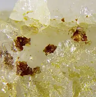 ![]() Cristales de tooeleita de la mina Alcantarilla, Belalcázar, Córdoba (España) | ||