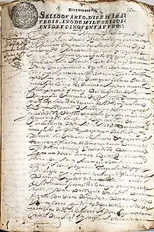 Sepan quantos esta carta vieren como yo, Diego Martín Pinzón Dávila, vezino de la villa de Moguer estante al presente en esta villa de Palos de la Frontera, digo: que por quanto el año de mill y seyscientos y veynte y seys y veynte y siete y veynte y ocho y veynte y nuebe estube en la villa de Madrid, Corte de su Magestad, pretendiendo una encomienda de yndios, la primera que ba Cassa y en el ynterinun ofisio de tesorero contador de Lima, Santa Fee de Buenos Ayres, del Cusco en el reyno del Pirú, como rebisnieto del Capitán Martin Alonso Pinzón, primero descubridor de las Yndias, que fue en compañía de Cristóbal Colón, y como susesor que soy por línia recta de varón del dicho Martín Alonso Pinzón e como susesor del solar y casa de los Pinzones y aviéndose visto los papeles e ynformasiones que sus Magestades los señores Reyes Católicos, Emperador Carlos quinto y Doña Juana, su madre, dieron al dicho mi agüelo y a Visente Yáñez Pinzón y a Francisco Pinzón, sus ermanos, salió auto en que yo mostrase sertificación de cómo no estavan premiados los dichos servicios, y aviéndose presentado se mandaron juntar con todos los autos que para consultar a su Magestad se me hisiesen en el dicho Consejo de Yndias, los quales dichos papeles, privilegios e ynformaciones e sertificasiones pararon en poder de Duarte Rdgz. de Lión, relator del dicho Consejo ...