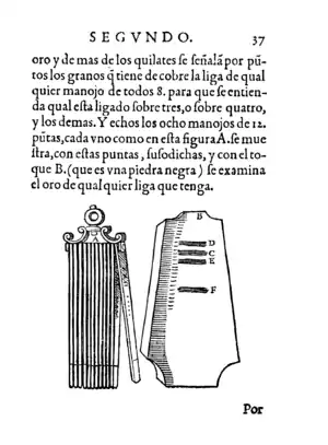 Y hechos los ocho manojos de 12 puntas, cada uno como en esta figura A se muestra, con estas puntas, susodichas, y con el toque B (que es una piedra negra) se examina el oro de cualquier liga que tenga. Por que tomando el oro que quieren tocar y estregándolo en el toque, a la parte C quedando teñido del color que tiene el oro, se mira si es encobrado o franco y se toma una punta que sea la más vecina a aquel color y con ella se toca un poco más abajo otra señal a la E. Y si estuviere del mismo color será de la misma ley y liga. Y si no, se pone encima otra a la D. Y si ninguna viene, se torna a teñir otra vez más abajo a la F y junto con las puntas se va tocando hasta que se encuentra con alguna en el color, y entonces será de aquella ley de la punta, poco más o menos. (Quilatador, Libro segundo, capítulo viii: De cómo se hacen las puntas para tocar el oro, p. 37.)