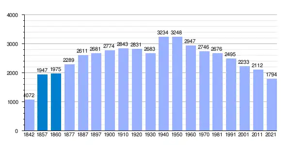 | Gráfica de evolución demográfica de Toral de los Vados[18] entre 1842 y 2021 |