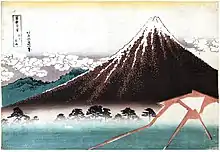 La composición es muy similar a la de Fuji rojo, de la misma serie, pero la atmósfera es diferente: en lugar de una vista brumosa y serena, el monte Fuji se representa más oscuro, en tonos fuertes y pesados. Los contornos de la ladera de la montaña están más texturizados y definidos. El casquete nevado se eleva bruscamente sobre una base oscura y amenazante, que ha sido dividida por un rayo de luz representado con líneas contundentes en zigzag, casi abstractas. Al igual que con Fuji rojo se usa una delgada línea de azul de Prusia en la parte superior del cielo, pero a diferencia de este grabado las nubes tienen una forma similar al humo y parecen adherirse a la montaña.[3] Los tres picos en la cumbre sugieren que esta vista es de la parte posterior del Fuji (es decir, desde el oeste), otro contraste con la impresión Fuji rojo.[4]