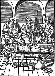Según un tratadista castellano del siglo XVII el tormento de la toca consistía en "meter al reo una toca por el gaznate... y con ella para que entre en el cuerpo, le echan algunos cuartillos de agua".[3]