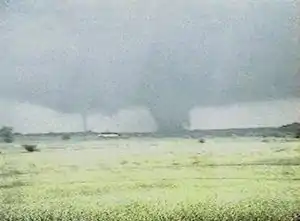 Ejemplo de un tornado satélite. El tornado de la derecha es el famoso tornado de Moore, registrado en 1999. El más pequeño a la izquierda es el tornado satélite.