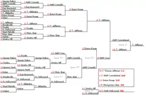 Otra es la variante equilibrada , que es una disposición de soporte que no está estrictamente dividida en dos soportes en función del número de pérdidas. Los jugadores con diferentes números de pérdidas pueden jugar entre ellos en cualquier ronda. Un objetivo de la variante es que ningún jugador permanezca inactivo durante más de una ronda consecutiva. La complejidad adicional de los corchetes se maneja mediante el uso de coincidencias "si es necesario". El enfoque flexible permite realizar diseños prácticos de soportes para cualquier número de competidores, incluidos números impares (9, 10, 11, 12, 13, etc.).[4]
