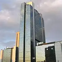 El complejo consta de una torre central y dos edificios bajos que la rodean. La torre está cubierta de vidrio.