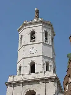 Entre 1703 y 1709, siguiendo las trazas de Herrera, aunque no de manera muy fiel, se levantó la torre de poniente.[1] Años más tarde cuando se construyó el segundo cuerpo de la fachada con las trazas de Churriguera, se modificó la torre añadiéndole un cuarto piso ochavado[2] donde se instaló un número superior de campanas al proyectado por Herrera, cerrándolo con cubierta de cascos de sección ojival. Entre el segundo piso y el tercero se instaló un reloj. Dirigió la obra el maestro de cantería Antonio de la Torre. Según aparece en muchas fuentes de la época, la torre tenía unos 270 pies de altura (aproximadamente 75 metros) y era con mucho, el edificio más alto de Valladolid.