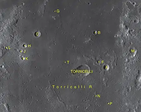 Por convención estos elementos son identificados en los mapas lunares poniendo la letra en el lado del punto medio del cráter que está más cercano a Torricelli.