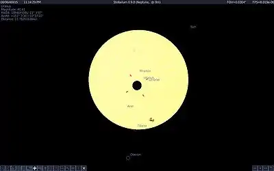 - Esta obra contiene una traducción derivada de «Transit of Uranus from Neptune» de Wikipedia en inglés, publicada por sus editores bajo la Licencia de documentación libre de GNU y la Licencia Creative Commons Atribución-CompartirIgual 4.0 Internacional.