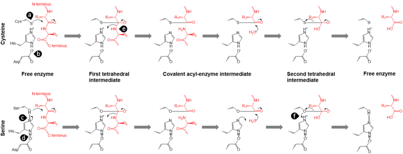 en la enzima en su estado basal[25] (a) y muchas incluso carecen del miembro acídico de la tríada (b). La serina es también más dependiente de otros residuos para reducir su pKa[24] para la desprotonación concertada con catálisis (c) para optimizar la orientación de los miembros ácido-base de las tríadas (d).[2] El bajo pKa de la cisteína funciona en contra de la resolución del primer intermediario tetraédrico ya que la reacción inversa e improductiva del ataque nucleofílico original es el producto de ruptura más favorable.[2] La base de la tríada, por lo tanto se encuentra preferentemente orientada para protonar al grupo saliente amida (e) para asegurar que es eliminado dejando al azufre unido covalentemente al extremo N-terminal del sustrato. Finalmente, la resolución del complejo acil-enzima (para liberar el extremo C-terminal del sustrato) requiere que la serina sea reprotonada (f) mientras que la cisteína puede salir como S−