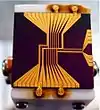 La magnitud mínima del campo magnético puede lograrse mediante el llamado «microchip atómico».[2] En la figura se muestra uno de los primeros microchips utilizados como trampa atómica. El conductor en forma de Z (el circuito dorado impreso sobre la superficie de silicio) se coloca dentro del campo magnético uniforme cuya fuente no se ve en la figura. Solo serán atrapados los átomos con campo magnético de spin positivo. A fin de prevenir la mezcla de estados de spin, el campo magnético externo se inclinó en el plano del chip, proveyendo la rotación adiabática del spin al movimiento del átomo. En una primera aproximación solo la magnitud, pero no la orientación del campo magnético es responsable de la energía necesaria para atrapar al átomo.
