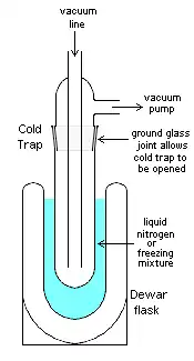 En aplicaciones de vacío, una trampa fría es un dispositivo que condensa todos los vapores en un líquido o sólido, excepto los gases permanentes.[2] El objetivo más común es evitar que los vapores de una bomba de vacío contaminen el experimento o muestra de interés. Las trampas de frío también se refieren a la aplicación de superficies de refrigeración o deflectores para evitar que los vapores de aceite fluyan desde el interior de una bomba de vacío hacia un determinado recipiente. En tal caso, un deflector o una sección de tubería que contiene una serie de paletas enfriadas, se adjuntará a la entrada de un sistema de bombeo existente. Enfriando el deflector, ya sea con un refrigerante como el nitrógeno líquido, o mediante el uso de un elemento Peltier de accionamiento eléctrico, las moléculas de vapor de aceite que golpean los álabes deflectores se condensarán y por lo tanto serán eliminados de la cavidad de bombeo.