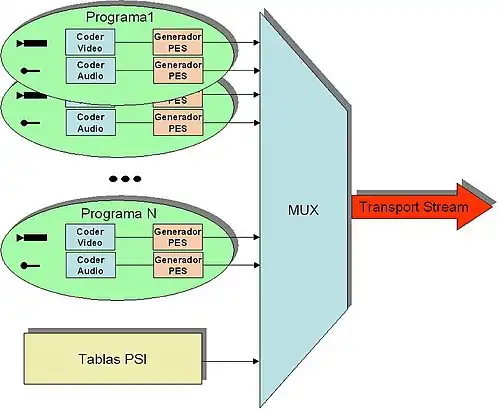 Estos paquetes de video y audio, así como de otros datos de un mismo programa, pasan posteriormente a un multiplexor donde se conforma un solo tren binario. Para esta multiplexación, el grupo de estándares de MPEG-2 distingue entre dos posibilidades: la conformación de una “corriente de programa” (PS – Program Stream) y la conformación de una “corriente de transporte” (TS - Transport Stream).