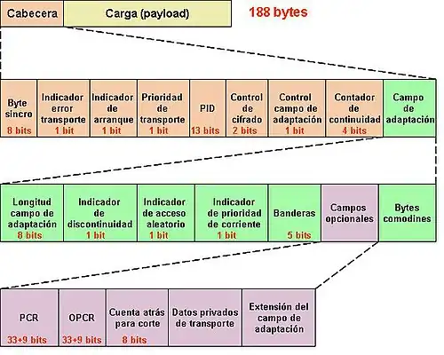 - Control de carga: Indica si hay o no datos de carga útil. Se suele tomar el Control campo de adaptación como 2 bits y según sea 10, 01 o 11 indica si hay datos de adaptación, de carga o de ambos.