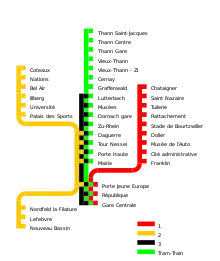Las tres líneas puramente de tranvía se cruzan en la parada de Porte Jeune en el centro de Mulhouse y comprenden las siguientes:[1]