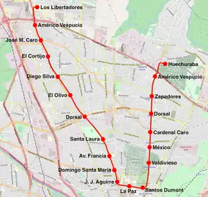 - Conchalí/Independencia/Recoleta: En 2001 fue presentado el proyecto para una línea que iniciaría en la Carretera General San Martín (cercano a la actual estación Los Libertadores), avanzaría hacia el sur por avenida Independencia, girando hacia el oriente en Santos Dumont (en donde se planteaba combinar con la estación Cerro Blanco de la Línea 2 del Metro de Santiago) y seguir hacia el norte por avenida Recoleta hasta la intersección de avenida Recoleta con Santa Clara, en la comuna de Huechuraba. Dicho proyecto fue finalmente desistido y reemplazado por la extensión de la Línea 2 hasta Américo Vespucio, mientras que el tramo por la avenida Independencia quedaría definitivamente descartado con la construcción de la Línea 3 del metro.[55][56]