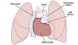 ![]() Diagrama ilustrando la colocación de un corazón donado por el procedimiento de trasplante cardíaco ortotópico. | ||