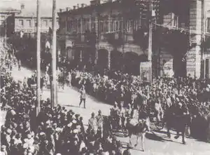 El 29 de abril de 1918, los alemanes ejecutaron un golpe de Estado contra la Rada socialista, y colocaron a Pavló Skoropadski en el poder, un período conocido como el Hetmanato.[54] Después del Armisticio de Compiègne, el Hetmanato fue derrotado por el Directorio de Ucrania, ya que Skoropadski perdió el apoyo alemán,[56] y el Ejército Blanco Ruso no fue capaz de evitar su derrota.