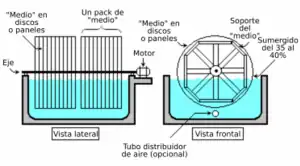 Un contactor biológico rotativo o RBC es un proceso de tratamiento biológico de película fija que se utiliza en el tratamiento secundario de aguas residuales tras el tratamiento primario.[8][9][10][11][12] El proceso de tratamiento primario implica la eliminación de arenas y materiales gruesos en suspensión mediante un proceso de cribado, seguido de la sedimentación de los sólidos en suspensión. El proceso de RBC permite que las aguas residuales entren en contacto con una película biológica para eliminar los contaminantes presentes en las aguas residuales antes de verter las aguas residuales tratadas al medio ambiente, normalmente una masa de agua (río, lago u océano). Un contactor biológico rotativo es un tipo de proceso de tratamiento secundario (biológico). Consiste en una serie de discos paralelos muy próximos entre sí montados sobre un eje giratorio que se apoya justo encima de la superficie de las aguas residuales. En la superficie de los discos crecen microorganismos que degradan biológicamente los contaminantes de las aguas residuales.