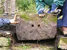 Sillar de piedra utilizado en su momento como apoyo del carril en el antiguo Ferrocarril de Kilmarnock y Troon
