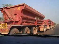 Al llegar a zonas urbanas los trenes de carretera se desarman y los remolques de carga son enganchados individualmente a camiones comunes.