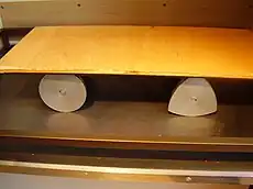 • Un triángulo de Reuleaux puede rodar fácilmente, pero no funciona bien como rueda debido a que no tiene un centro fijo de rotación. Sin embargo, en la figura adjunta la tabla puede hacerse avanzar de manera perfectamente horizontal. En el rodillo de la izquierda habrá un eje que solo se desplace horizontalmente, mientras que en la sección del rodillo de la derecha, que es un triángulo de Reuleux, todos los puntos tienen algo de movimiento vertical, como se aprecia en la animación de la broca de Harry Watts.