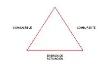 El triángulo de fuego o triángulo de combustión es un modelo que describe los tres elementos necesarios para que se produzca fuego o combustión. Se deben encontrar presentes los tres lados del triángulo para que se produzca el fuego, sin alguno de ellos, no sería posible, ellos son: un combustible (agende reductor), un comburente (un agente oxidante como el oxígeno) y energía de activación que genere una alta temperatura (calor).[1] Cuando estos factores se combinan en la proporción adecuada, el fuego se desencadena. Por otra parte, es igualmente posible prevenir o atacar un fuego eliminando uno de ellos.[2][3]
