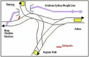 La Estación de Sefton, en Sídney, se encuentra en una esquina de un cruce triangular, que permite que los trenes se ramifiquen en cualquier dirección, sin la necesidad de terminar o cambiar de extremo. Un tren al día desde Birrong a Sefton termina y retrocede en la estación Regents Park (para limpiar el óxido de los carriles). Existe una terminal de mercancías en Chullora, y en el futuro la posibilidad de una línea de carga de vía única propuesta. Las tres estaciones de pasajeros en los vértices del triángulo tienen andenes interiores que facilitan cambiar de tren. Las curvas cerradas del triángulo y especialmente los desvíos en esas curvas cerradas restringen las velocidades de los trenes entre los 10 y los 50 km/h.