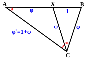El triángulo áureo es isósceles y tiene una relación entre patas y base igual al número áureo, y con ángulos de 72°, 72° y 36° en las proporciones 2: 2: 1. Se puede dividir en otro triángulo áureo y en un gnomon áureo, también isósceles, con una relación de base a pata igual a la proporción áurea y con ángulos de 36°, 36° y 108° en las proporciones 1: 1: 3.[14]