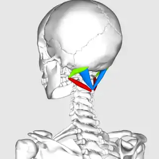 ![]() Los músculos que rodean el triángulo suboccipital. Músculo recto posterior mayor de la cabeza Músculo oblicuo superior de la cabeza Músculo oblicuo inferior de la cabeza | ||