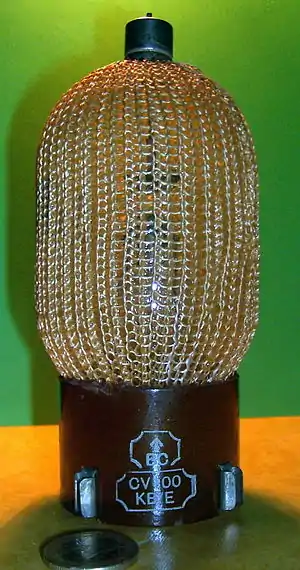 Los trigatrones utilizados en la Segunda Guerra Mundial contenían mezclas de argón a alta presión. Para minimizar el riesgo de explosión, iban envueltos en una camisa de red. En la foto se muestra el CV100, de 250 kW de potencia y vida de unas 2000 horas.