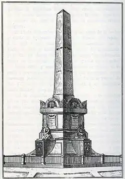 Su monumento representa alegóricamente las virtudes filantrópicas del fallecido: la fe, el valor, la caridad y la templanza.