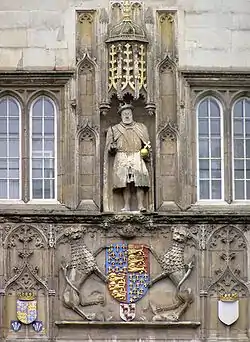 - Es la entrada principal al college, conduce hasta el Great Court. Una estatua del fundador del college, Enrique VIII se encuentra en un nicho sobre la puerta. En su mano sostiene la pata de una silla en lugar de la espada tradicional, hay varios mitos sobre quién y cómo se llevaron la espada. En 1704, el primer observatorio astronómico de la Universidad se construyó en el tejado de la puerta. Debajo de la estatua del fundador está el escudo de armas de Eduardo III, el fundador del King’s Hall, y cinco de sus hijos que llegaron a la madurez, así como William de Hatfield, representado por un espacio vacío debido a que murió siendo muy joven y no se le concedió un escudo.[17]