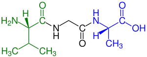 Un tripéptido (ejemplo Val - Gly - Ala) con extremo amino marcado en verde (L-valina) y extremo carboxilo marcado azul (L-alanina)